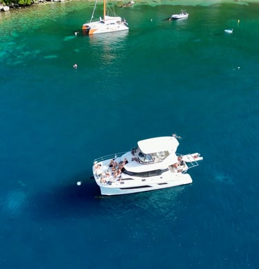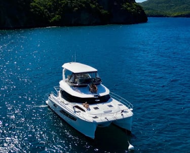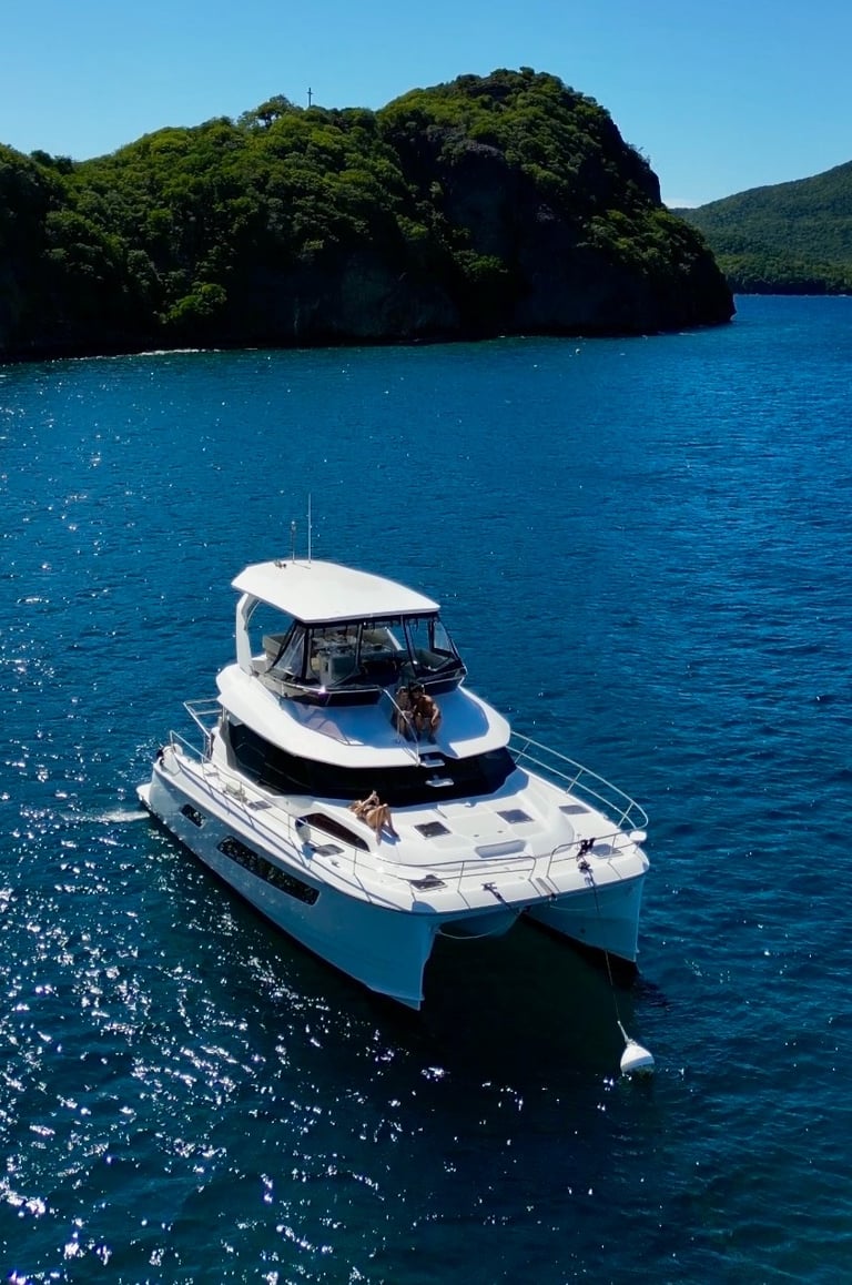 Navigation tranquille dans le lagon du Grand Cul-de-Sac Marin, eau turquoise et mer calme.
